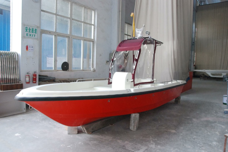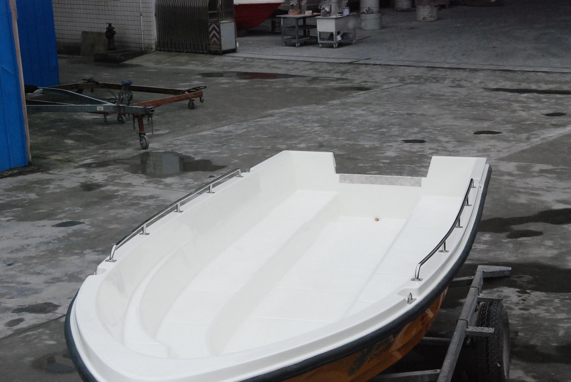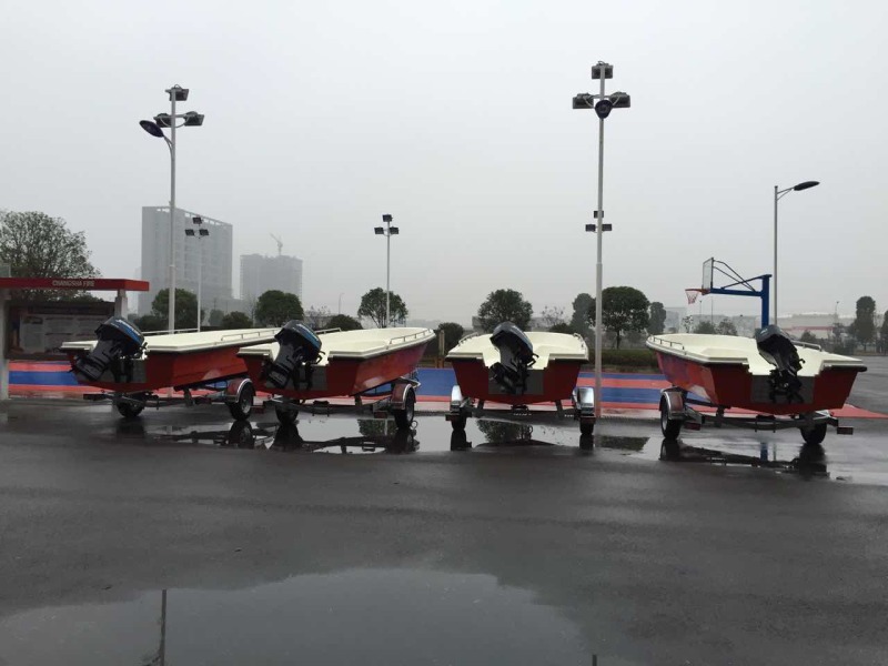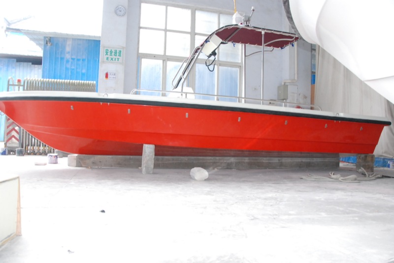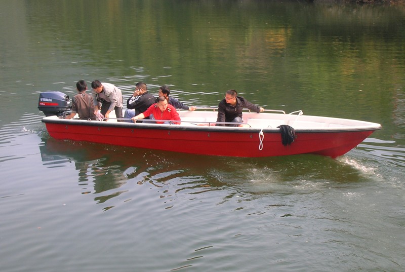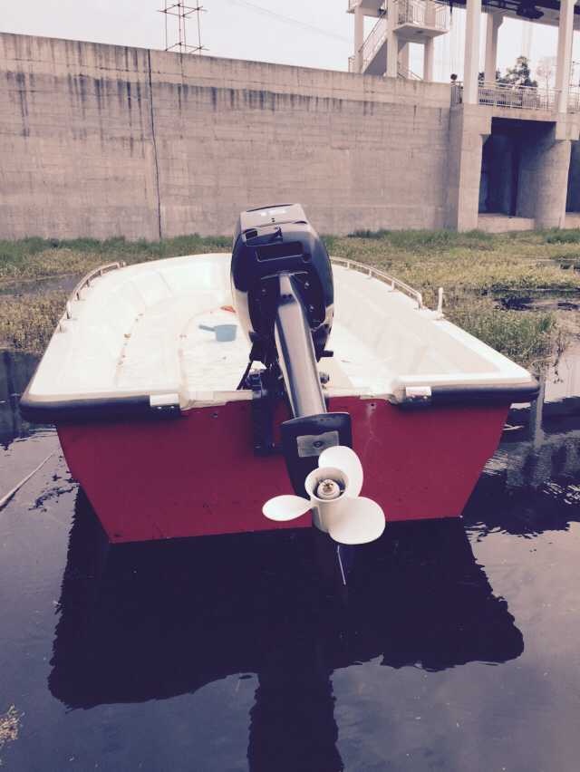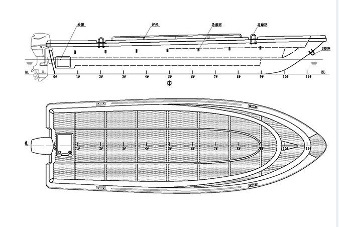 本艇為全玻璃鋼結構、用模具整體成型的單板結構舷外推進的高速艇。結構設計按《內(nèi)河高速船入級與建造規(guī)范》(2002)設計。穩(wěn)性、抗沉性符合本規(guī)范對B級航區(qū)的航行要求。設計乘員定額為12人。本艇采用舷外掛機推進,配置E40JMH手操式舷外掛機1臺,主機配套手提式塑料油箱25升1個,置于0#-1#肋位左舷。本艇采用手操式舷外掛機一臺。由駕駛人員手操舷外掛機轉動以及推進器的轉向,以達到自由、安全、可靠的使艇前進、倒退和艇體的轉向。在額定功率下航速可達40Km/h。