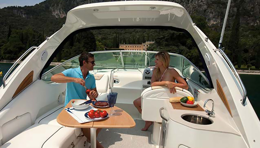 305 Sundancer是硬頂式的運(yùn)動(dòng)艇。對(duì)船主來(lái)說(shuō)能更好的應(yīng)對(duì)天氣變化,無(wú)縫設(shè)計(jì)的擋風(fēng)玻璃有著驚人的能見度。