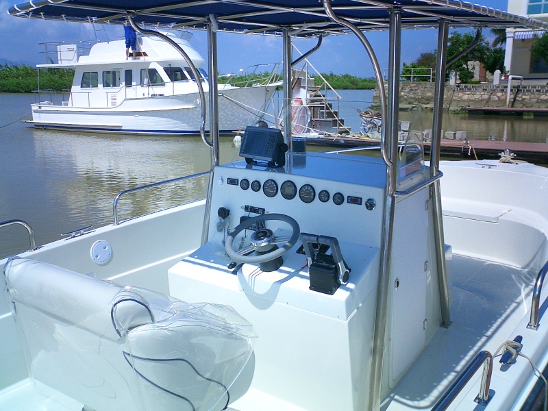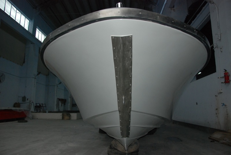 本艇為手糊成型的全玻璃鋼制高速艇,采用舷外掛機(jī)推進(jìn),本艇不夜航.本艇采用舷外機(jī)推進(jìn),配置150馬力舷外機(jī)2臺(tái)(或300馬力機(jī)一臺(tái)),燃油箱200升,置于1#+330-3#+80肋位之間。起動(dòng)電瓶采用蓄電池供應(yīng),電壓12V,電容量為70Ah。本艇采用的舷外機(jī)是電啟動(dòng)前操式的。由駕駛臺(tái)直接操縱發(fā)動(dòng)機(jī)的倒、順停、油門和舷外機(jī)的啟動(dòng)以及推進(jìn)器的轉(zhuǎn)向,以達(dá)到自由、安全、可靠的使艇前進(jìn)、倒退和艇體的轉(zhuǎn)向。駕駛臺(tái)上配有必要的操縱儀表和發(fā)動(dòng)機(jī)的儀表。在使用功率下航速可達(dá)45。